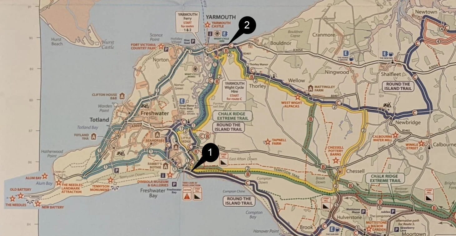Continuing with my bike ride to W Cowes, this leg from Freshwater to Yarmouth (IOW). The aim of this e-bike ride was to follow the West-Side of the official “Around the IOW Cycle Route”. Because the chain ferry is out of action again, I decided to cycle the West Side of the island on Sunday. Then cycle the East Side of the island another time.